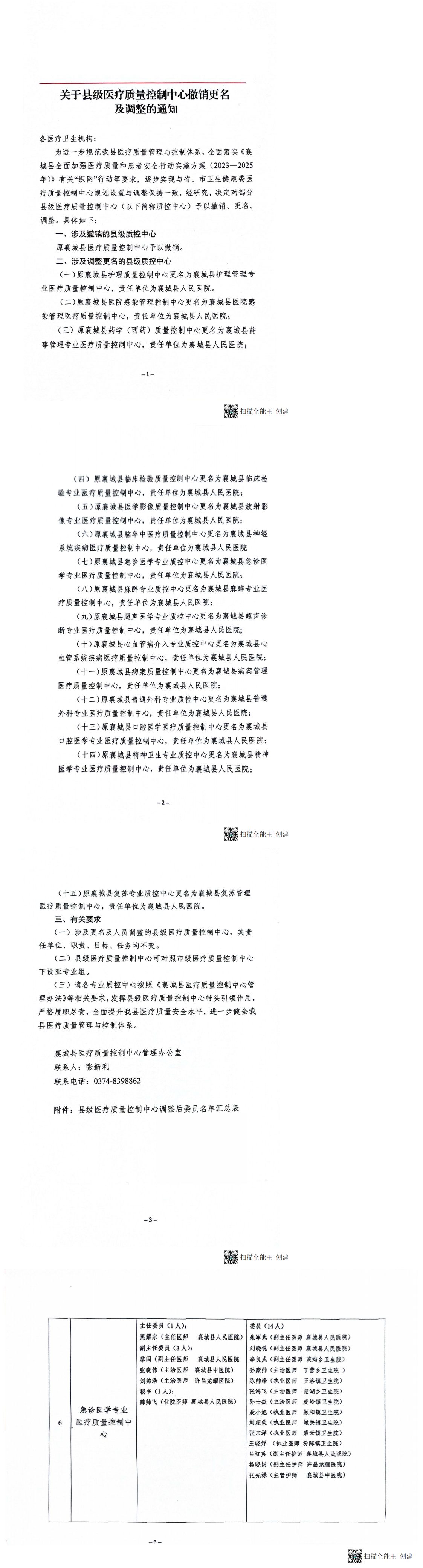 襄城县关于县级医疗质量控制中心撤销更名及调整的通知