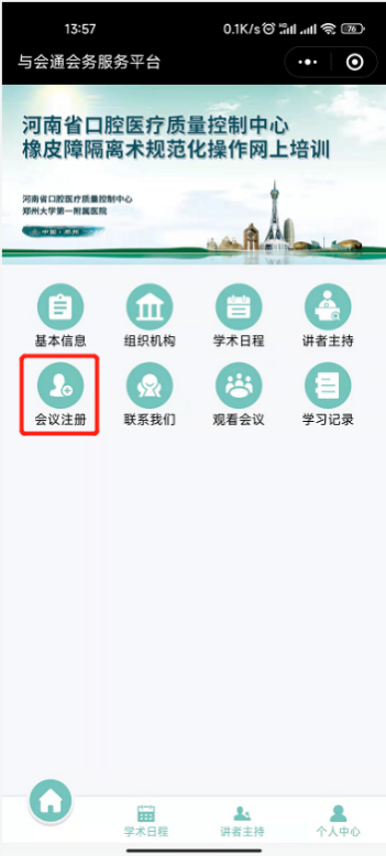登录成功后会跳转到会议首页面,点击【会议注册】按钮,如下图