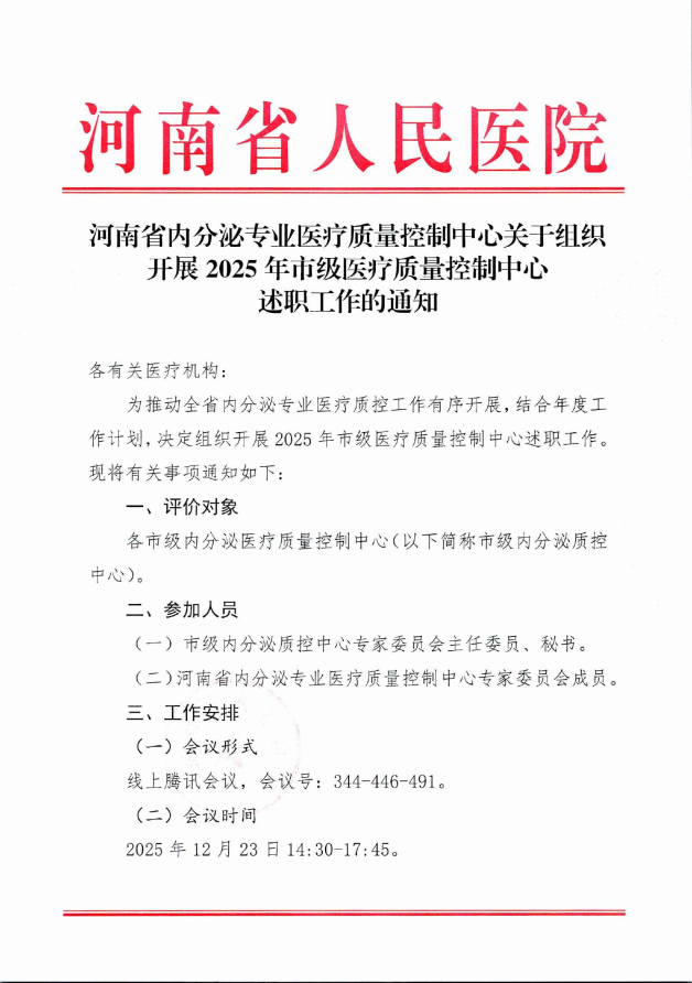 河南省内分泌专业医疗质量控制中心关于组织开展2025年市级医疗质量控制中心述职工作的通知
