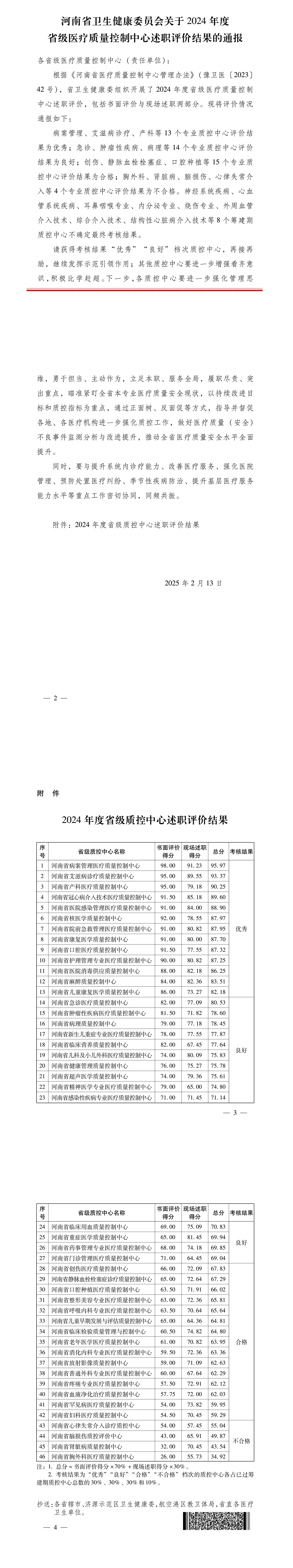 河南省卫生健康委员会关于2024年度省级医疗质量控制中心述职评价结果的通报