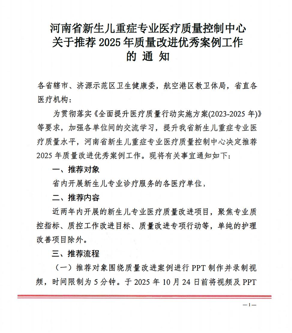 河南省新生儿重症专业医疗质量控制中心关于推荐2025年质量改进优秀案例工作 的通知