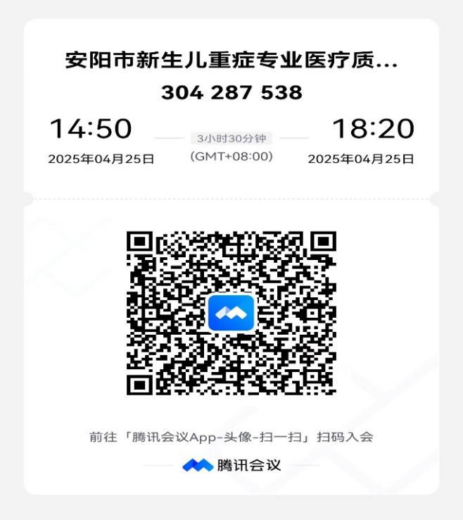 关于召开安阳市危重儿童和新生儿救治医疗 质量控制中心2025年第一次质控工作会暨质控专题培训会的通知 安阳市各医疗机构: 为进一步推动全市新生儿重症专业诊疗规范化、同质化,安阳市危重儿童和新生儿救治医疗质量控制中心决定召开2025年第一次 质控工作会暨质控专题培训会。现将有关事宜通知如下: 一 、会议内容: (一)总结2024年质控中心工作,部署2025年工作。 (二)通报2024年市级质控中心质控工作汇报。 (三)通报2024年安阳市质控数据。 (四)质控专题培训。 详见附件1。 二、会议时间 会议时间:2025年4月25日15:00-17:00。 三、会议形式 本次会议采取线上+线下形式 1.参会人员 (1) 安阳市危重儿童和新生儿救治医疗质量控制中心专家委员会成员 (2)全市二级以上医疗机构新生儿科医师。 2.参会方式 (1)线下:安阳市妇幼保健院新生儿科质控办 (2)线上:请扫描下方会议二维码参会。