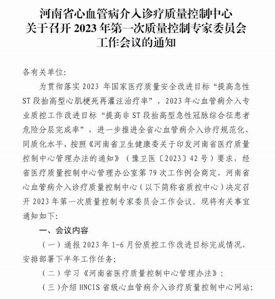 河南省心血管病介人诊疗质量控制中心 关于召开2023 工作会议的通知